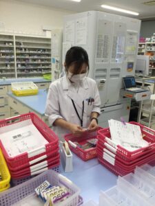 真岡店は門前が総合病院なので外来は午前中が多く、午後は施設の対応がメインになります。処方箋がきたら入力をし、処方変更がないか確認します。追加薬があれば日数調整や疑義紹介をし、その後分包し施設ごと用法ごとに色付けをします。薬剤師の監査後に一人づつ日付・用法ごとにテープ止めをしたり日付シールを貼ってお届けの準備をするまでが流れです。たまに医事課もお届けに行きますが、薬剤師がセットしやすいようにサポートをしています。