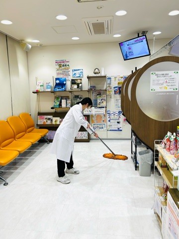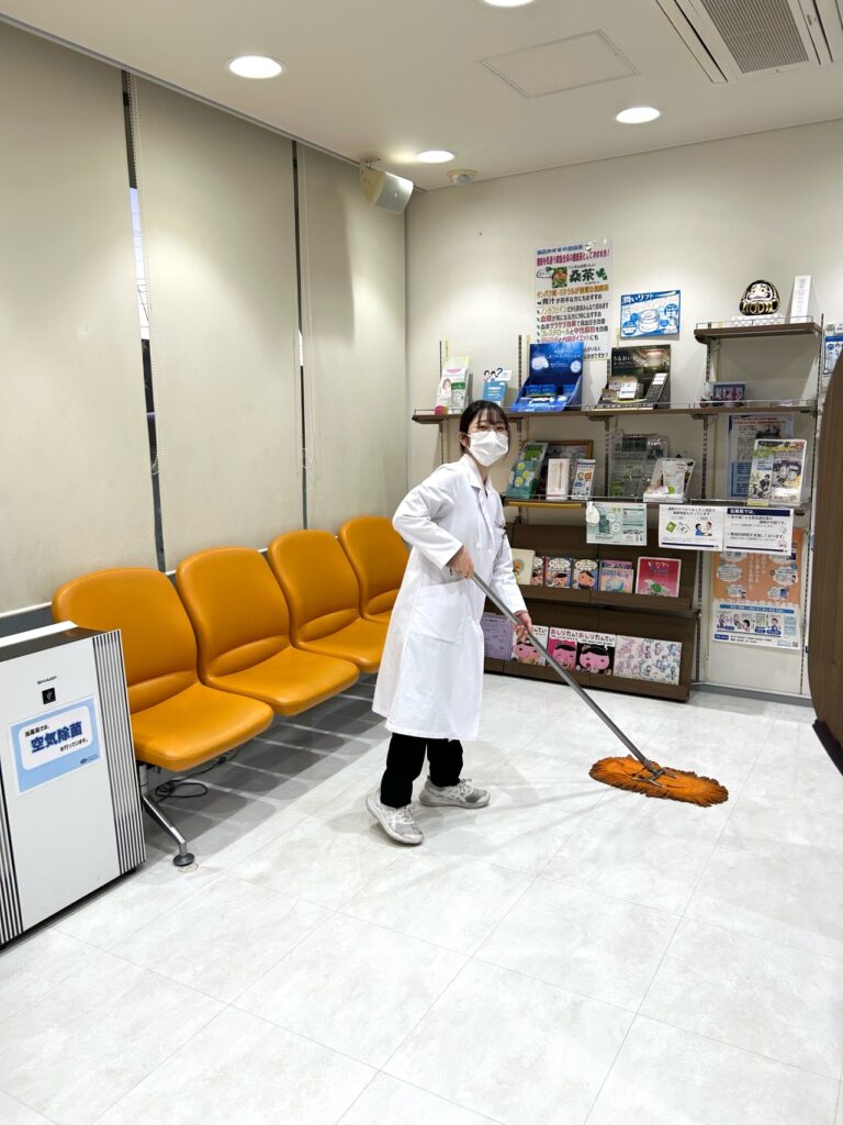 待合室のアルコール消毒、掃除、パソコンの立ち上げをして、患者さんを迎える準備をしていきます。