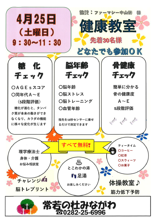 4月25日(土)常若の杜みながわ様にて健康教室に参加します!
