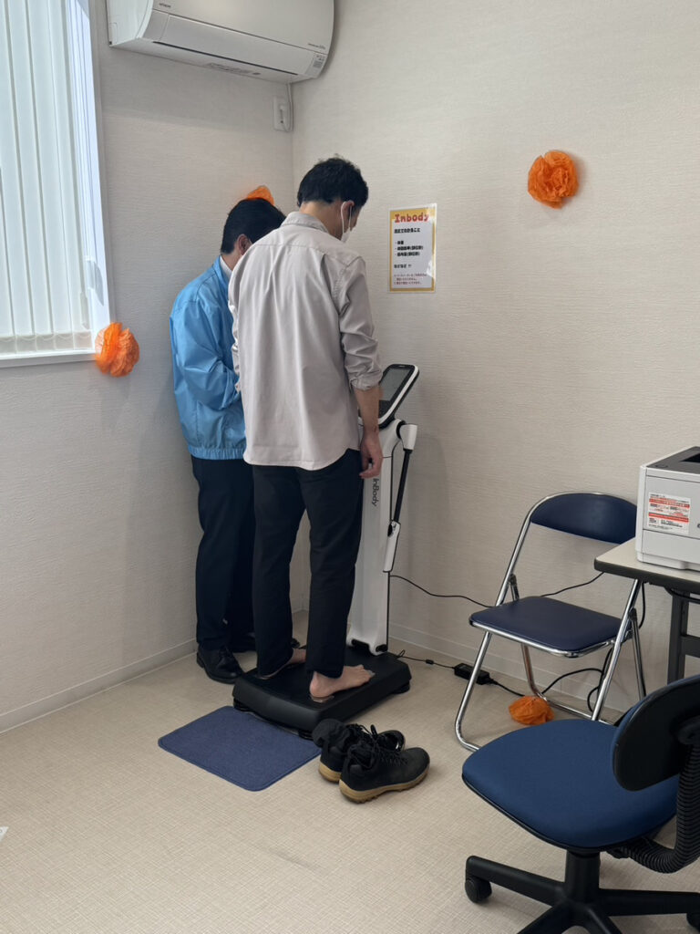 体の筋肉量や脂肪量などを測れるInBody、姿勢の測定、野菜の充足度チェックを行い、