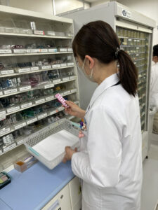 外来の処方箋が来た時はすぐに薬を準備し、薬剤師にバトンタッチします。その他、高齢者施設のお薬の準備にも関わります。